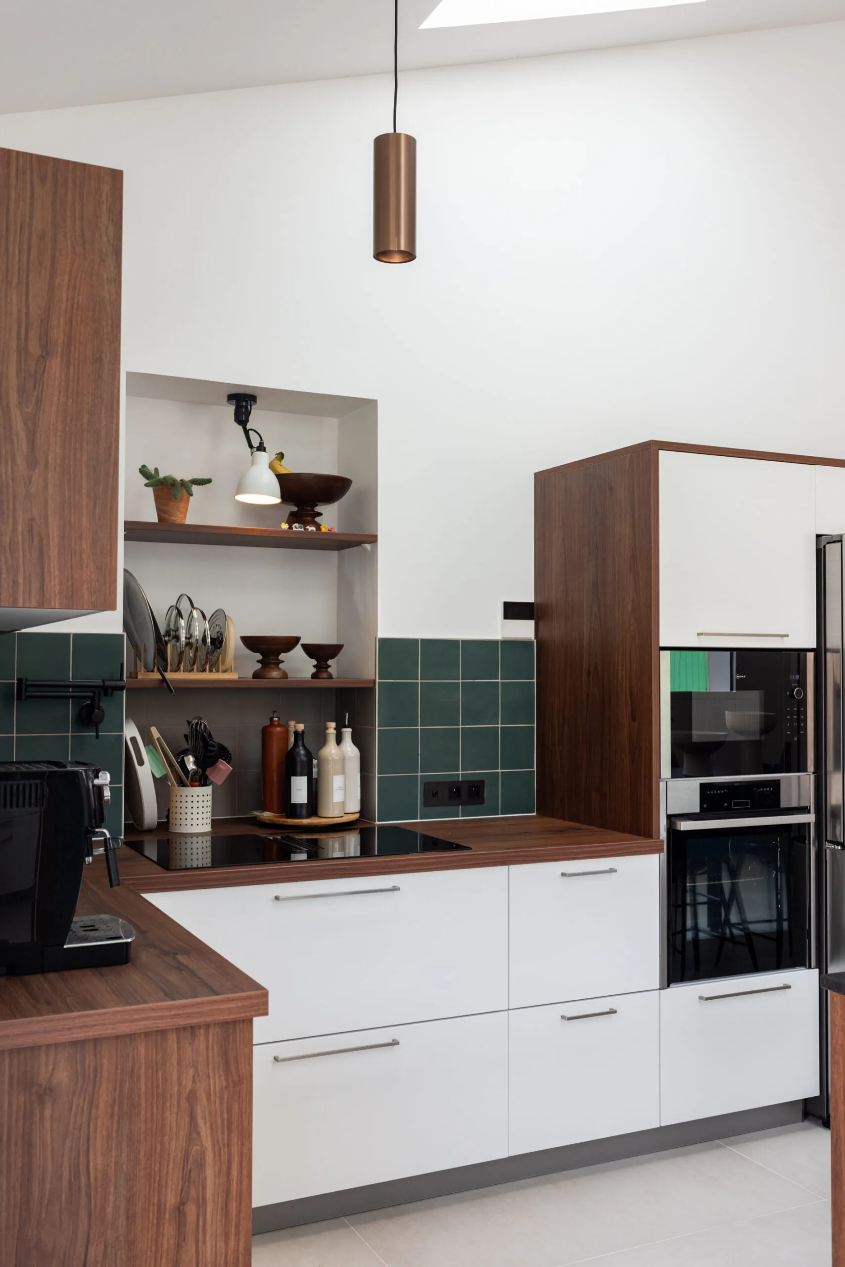 - Le plan de travail et la structure des meubles effet noyer qui contrastent avec les façades et réchauffent l’ensemble.