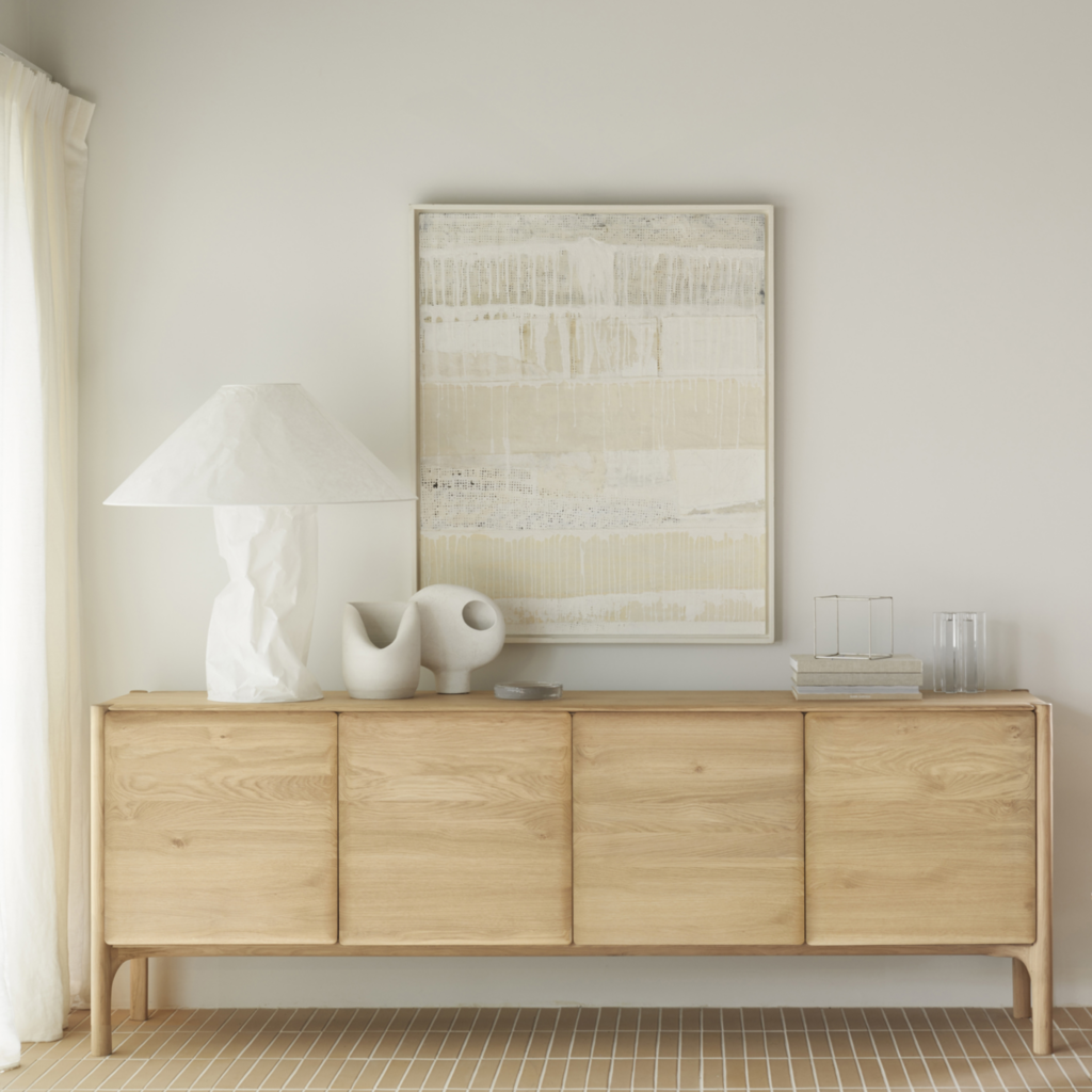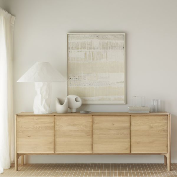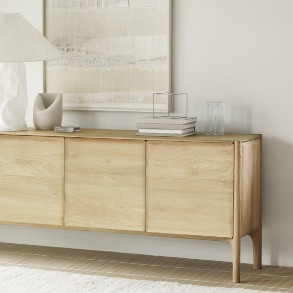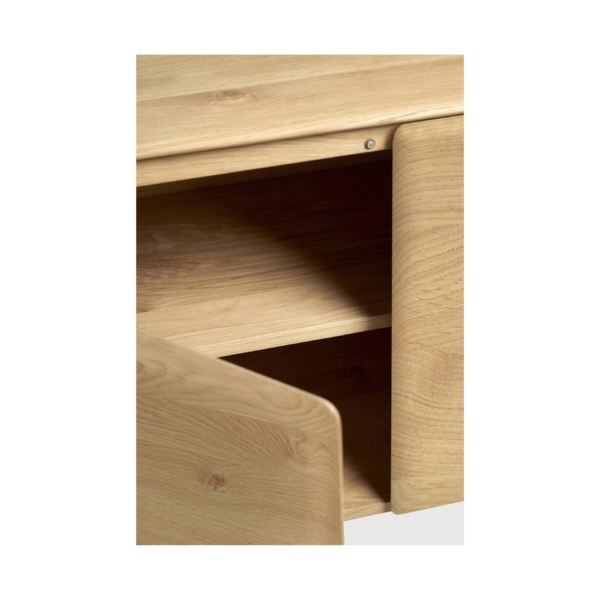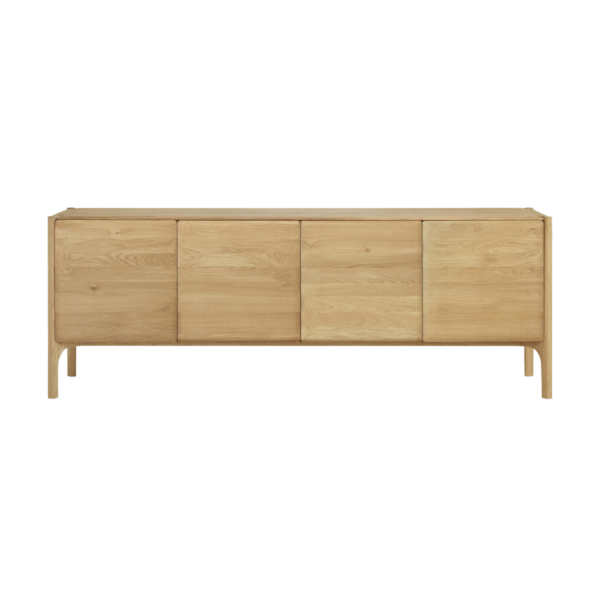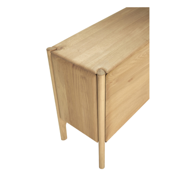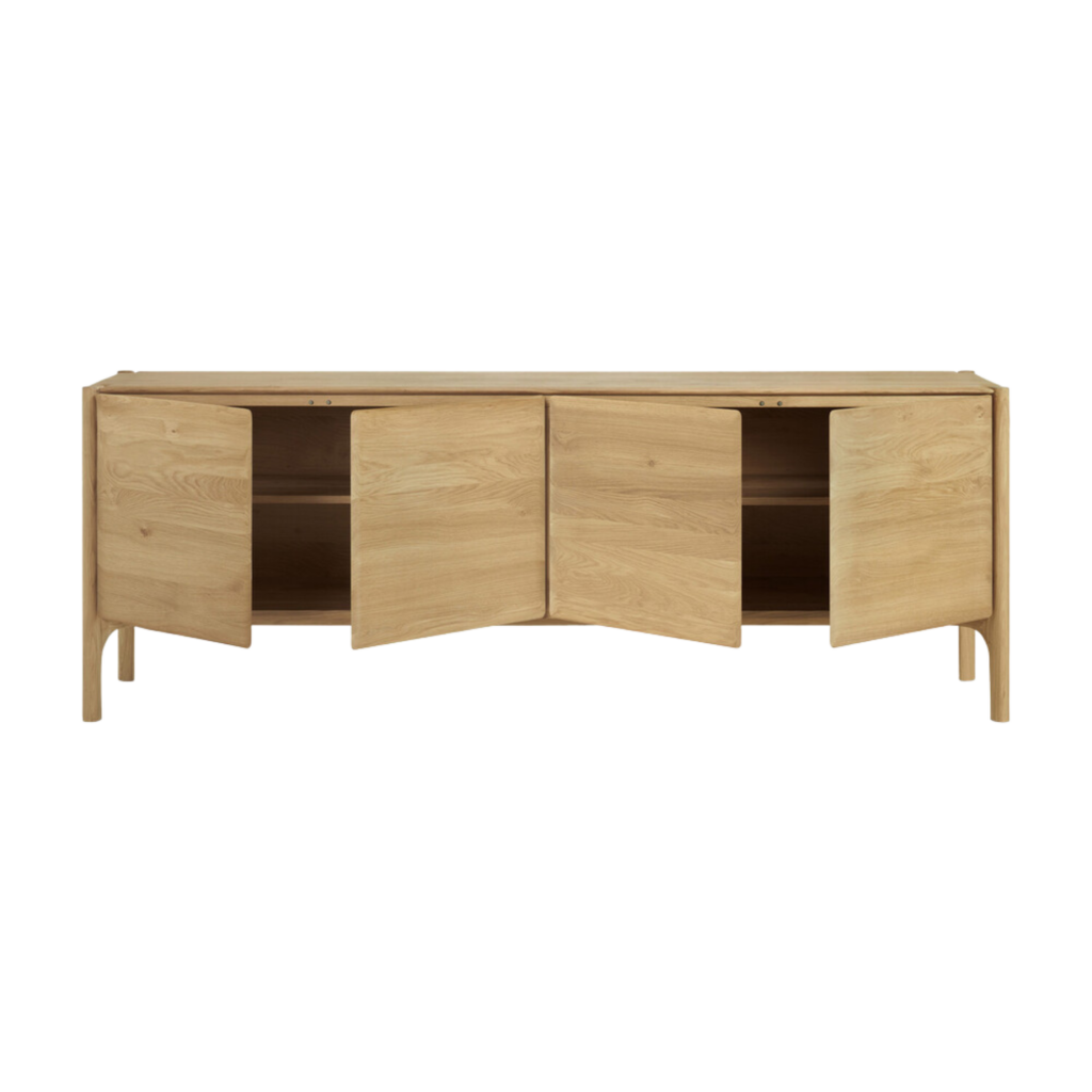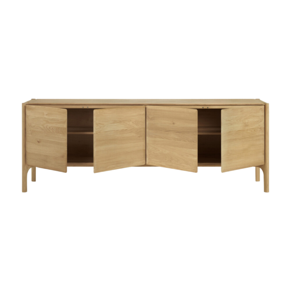 Ce buffet au design soigné s’inscrit dans une esthétique naturelle et fluide, où chaque ligne semble sculptée par le temps. Les courbes douces et les proportions équilibrées mettent en valeur le veinage du chêne massif, travaillé avec une finition huilée qui respecte l’authenticité du bois.