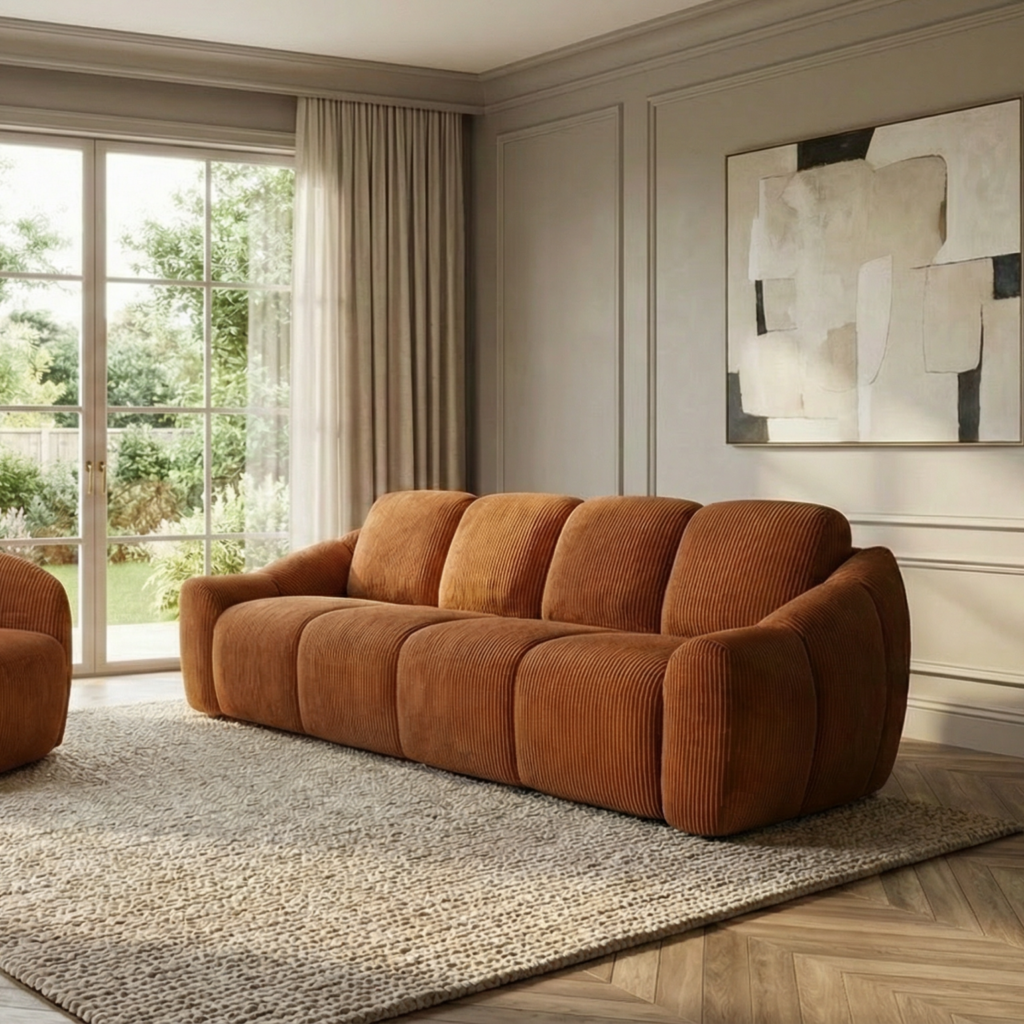 Le canapé Alaska incarne parfaitement l’équilibre entre design arrondi, confort généreux et praticité au quotidien. Son revêtement en velours côtelé épais lui donne un style chaleureux et contemporain, idéal pour sublimer un salon.