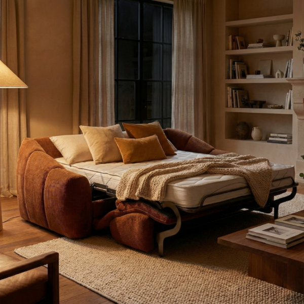Ce canapé se transforme en lit en un seul geste, sans retirer les coussins : un vrai gain de temps et un confort immédiat pour vos invités.