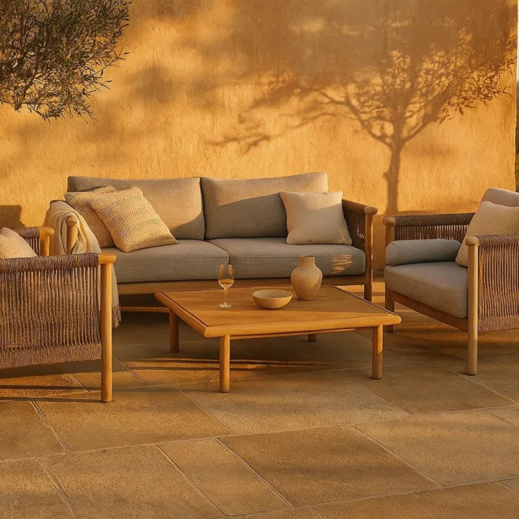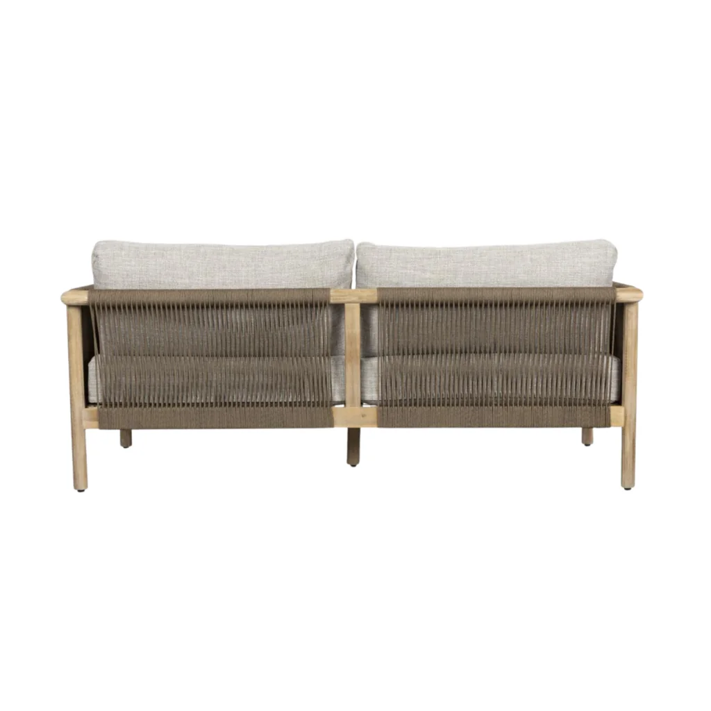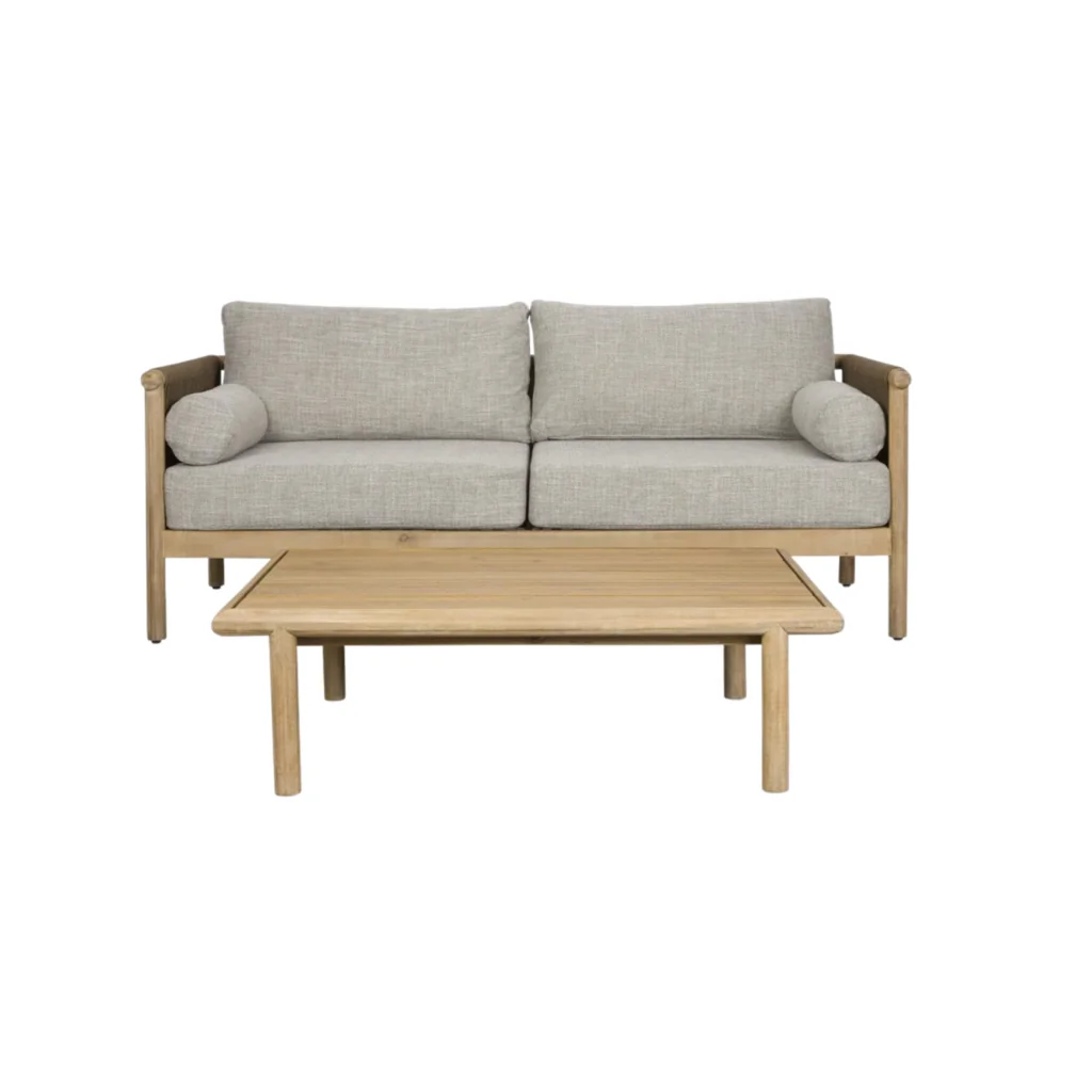 Cet ensemble complet comprend un canapé deux places et sa table basse assortie, pour créer un coin salon extérieur élégant et accueillant. La structure en bois d’acacia finition grise s’accorde parfaitement avec les coussins généreux en tissu oléfine hydrofuge. La table basse en bois massif complète le tout avec sobriété. Que ce soit pour lire, discuter ou siroter un café, cet ensemble transforme votre terrasse en véritable espace de bien-être. Le détail du cordage au dos du canapé apporte une touche graphique originale et artisanale.