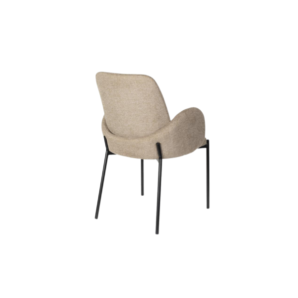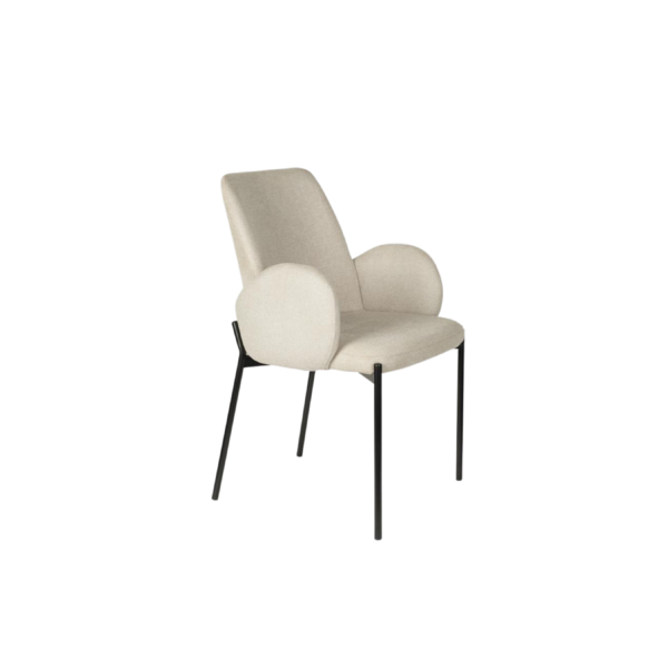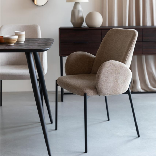 La chaise Tjarda séduit par son design moderne et son excellent confort d’assise. Sa structure en métal noir assure solidité et stabilité, tandis que l’assise généreusement rembourrée offre un confort idéal pour de longs repas. Le dossier, qui se prolonge naturellement en accoudoirs, forme une silhouette fluide et élégante.