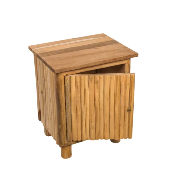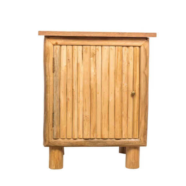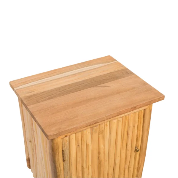 Fabriquée artisanalement en branches de teck naturel, elle se distingue par ses lignes organiques et sa teinte chaleureuse qui réchauffe l’atmosphère de votre espace.
