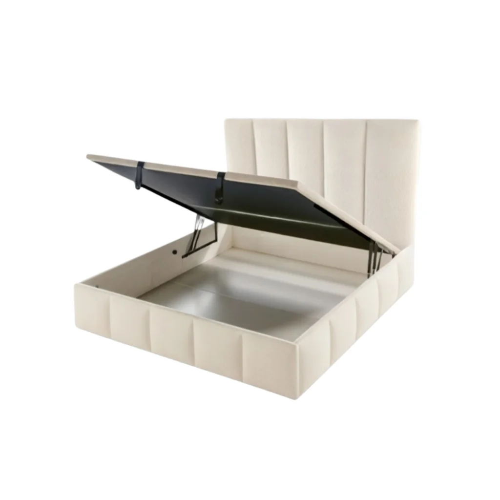 Le mécanisme à pistons à gaz assure une ouverture fluide et sans effort, révélant un grand coffre de rangement de 24 cm de profondeur intérieure — parfait pour couettes, oreillers ou linge de lit.