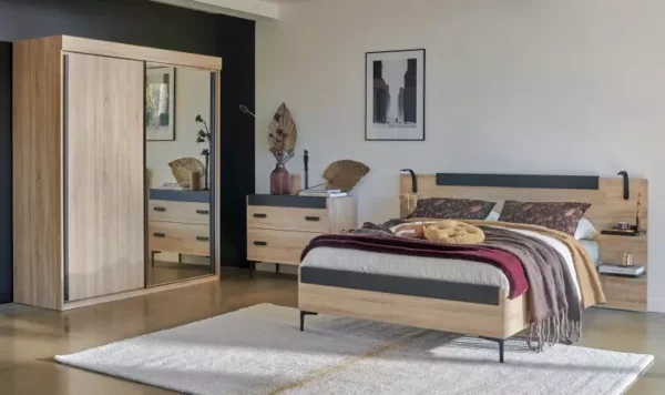 Ce couchage en chêne clair est sublimé par un bandeau noir à la tête et au pied qui lui confère élégance et modernité