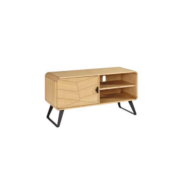 Compact et stylé, le meuble TV Tokyo s’impose comme une solution pratique pour les petits espaces sans faire l’impasse sur le design. Sa porte à décor chevron habille subtilement la façade, tandis que la niche avec tablette réglable permet d’organiser vos équipements multimédias. Les pieds en métal noir renforcent son allure moderne et assurent une belle stabilité.
