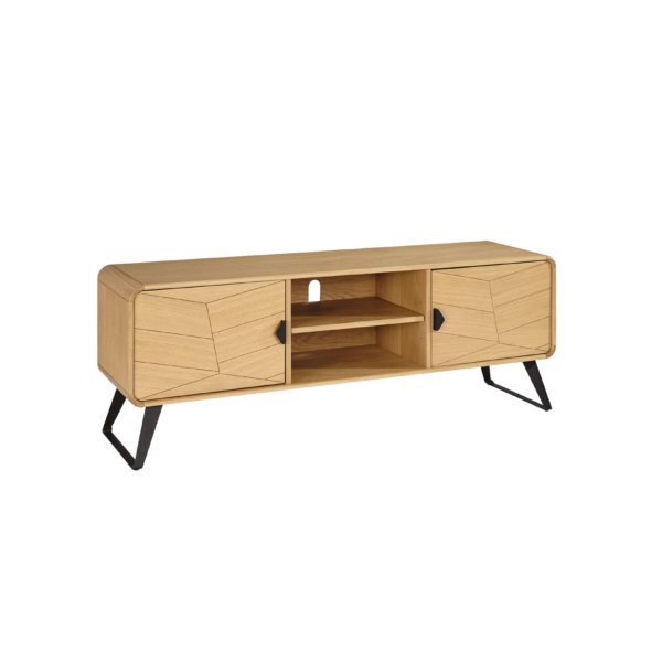 Ses deux portes au motif chevron dissimulent des rangements pratiques, tandis que la niche centrale accueille facilement vos appareils multimédias. La tablette réglable s’adapte à vos besoins, et les pieds en métal apportent une touche contemporaine et robuste à l’ensemble.