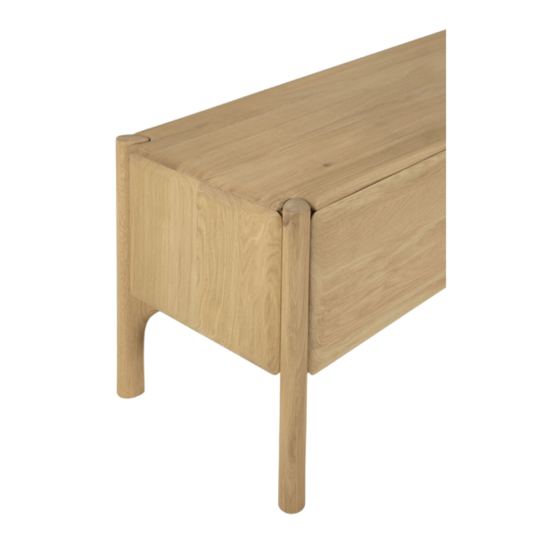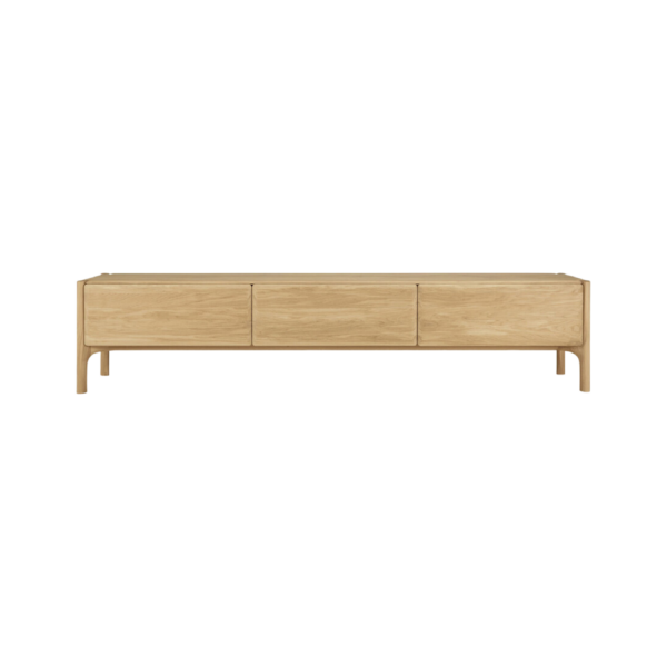 Fabriqué en chêne massif, le meuble est protégé par une finition huilée qui sublime le veinage et offre une texture chaleureuse et noble. Sa silhouette élégante accueille harmonieusement vos équipements multimédias tout en offrant de multiples solutions de rangement.