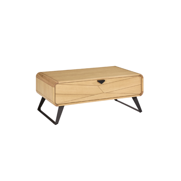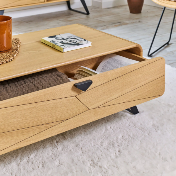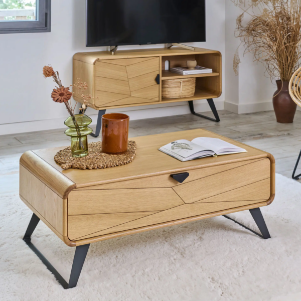 Avec son design graphique et ses finitions soignées, la table basse Tokyo impose son style tout en subtilité. Le tiroir avec façade chevron apporte une touche de caractère sans alourdir la ligne, tandis que le piètement en métal noir renforce l’allure moderne de l’ensemble.