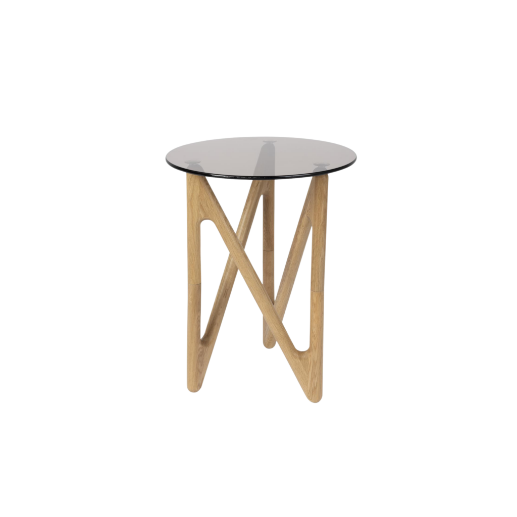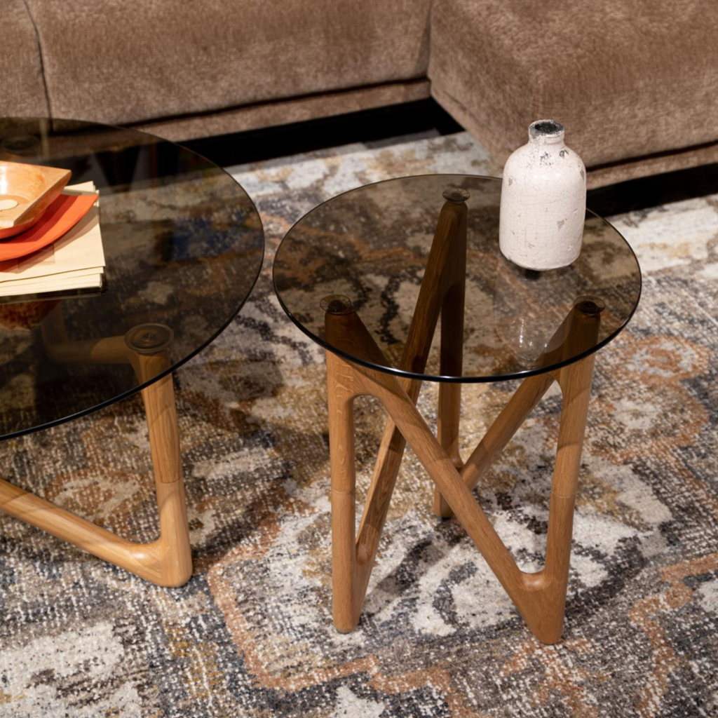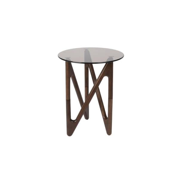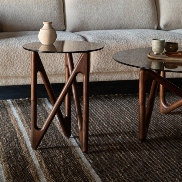 Le plateau en verre fumé circulaire repose avec légèreté sur cette base aérienne, apportant une touche rétro chic qui évoque l’élégance des intérieurs des années 70. Que vous la choisissiez en finition naturelle ou noyer foncé, Naia s’intègre facilement dans tout type de décoration, du contemporain au vintage.