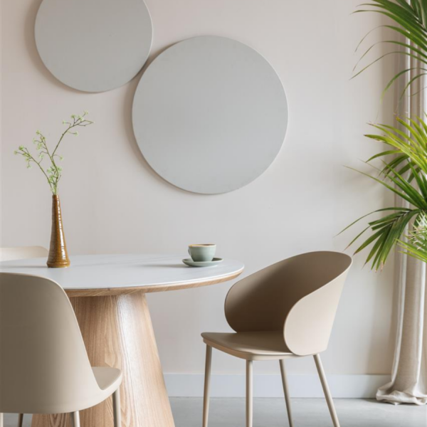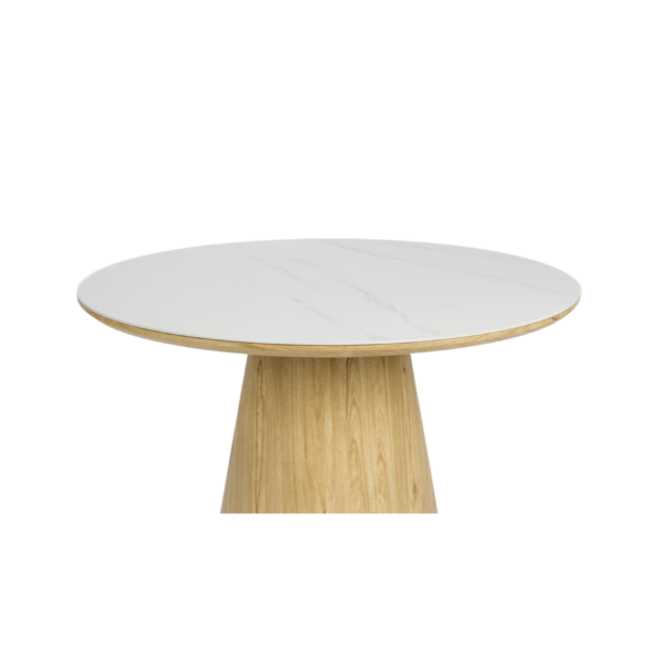 La table Almira se distingue par son design épuré et ses matériaux de qualité. Son plateau rond en pierre frittée offre une surface résistante, facile d’entretien et visuellement raffinée. Son pied conique, en MDF plaqué chêne, assure une parfaite stabilité tout en apportant une touche naturelle et contemporaine.
