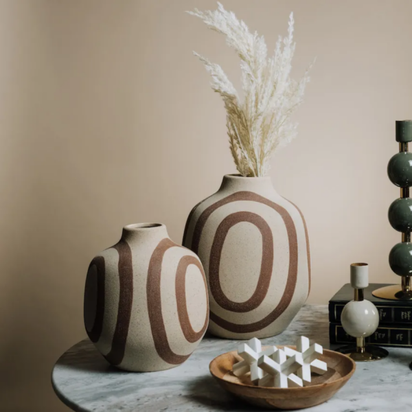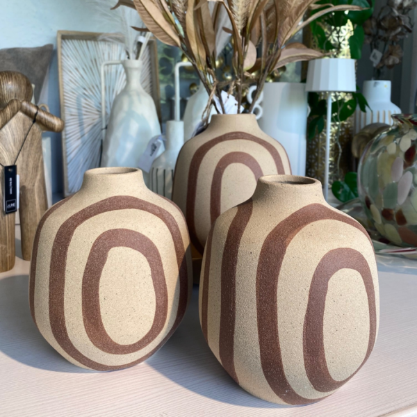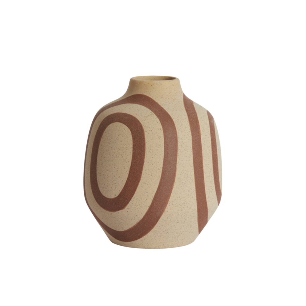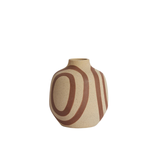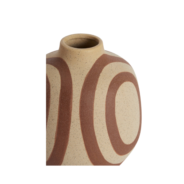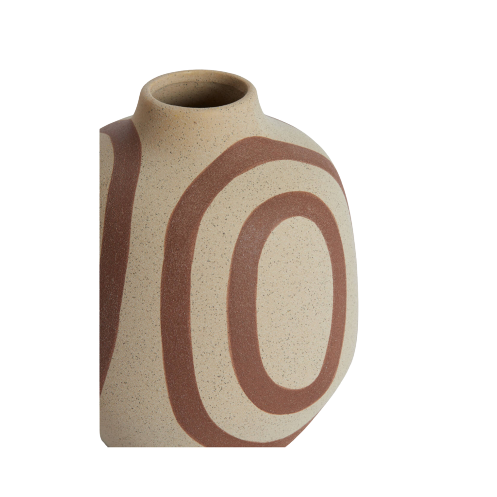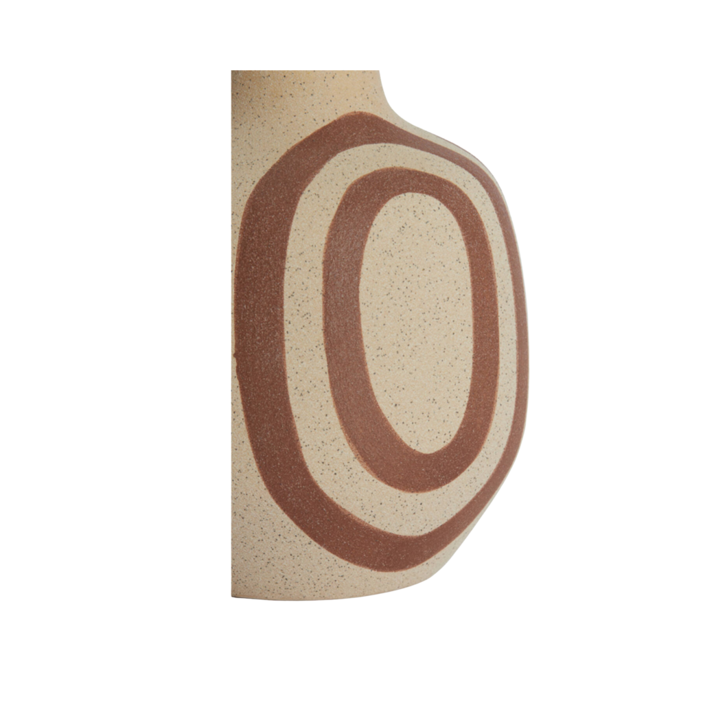 Avec ses lignes organiques et son motif graphique terracotta peint à la main, le vase UMYA séduit par son style à la fois moderne et artisanal. La texture mate, légèrement granuleuse et la teinte sable lui donnent un aspect brut très naturel, contrasté par les courbes dynamiques de ses dessins.