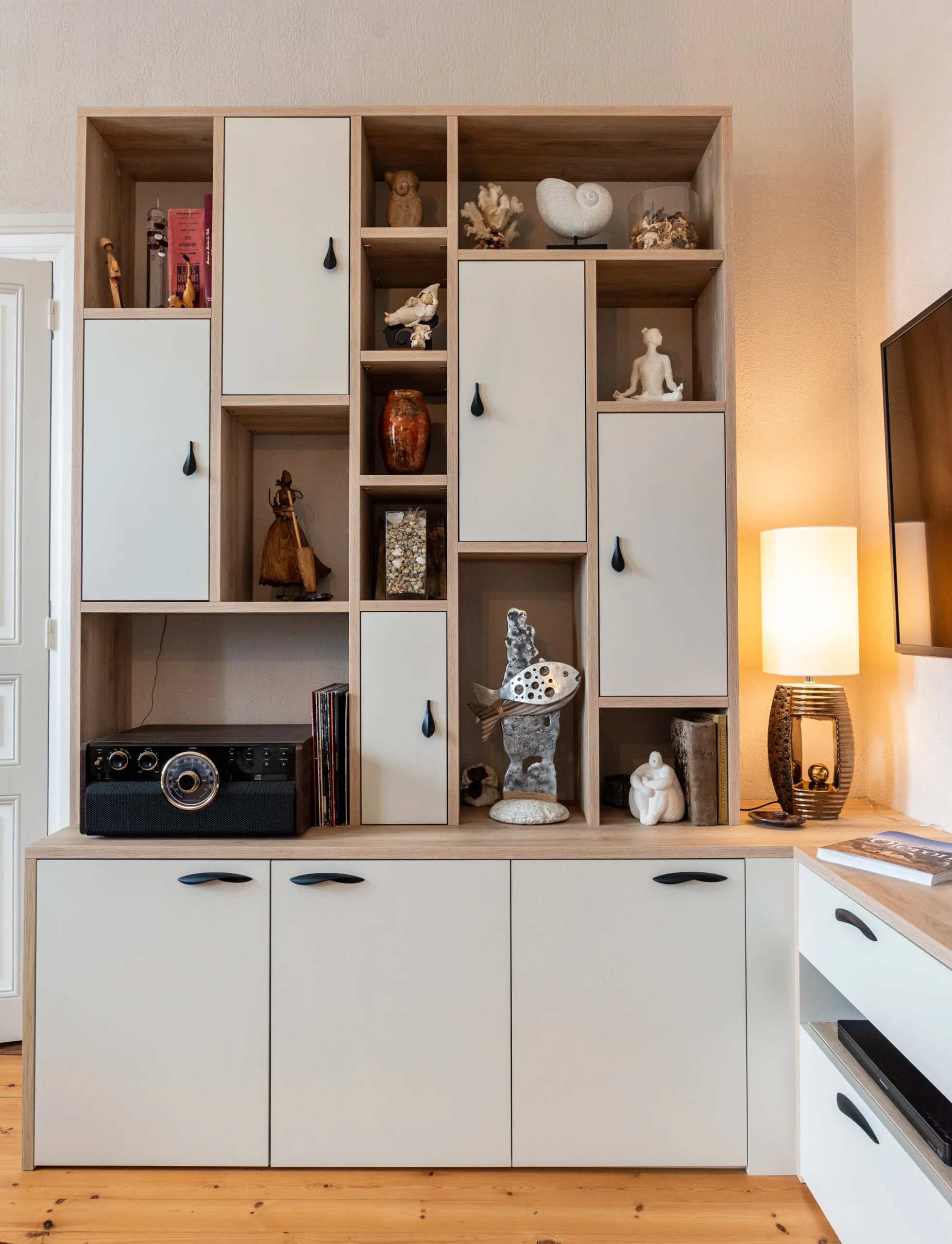 Nichée entre la porte et la cheminée, cette bibliothèque sur-mesure apporte de la hauteur à l’ameublement de ce salon. Elle accueille habilement objets de décoration, HIFI, accessoires TV et autres objets cachés dans les rangements fermés.