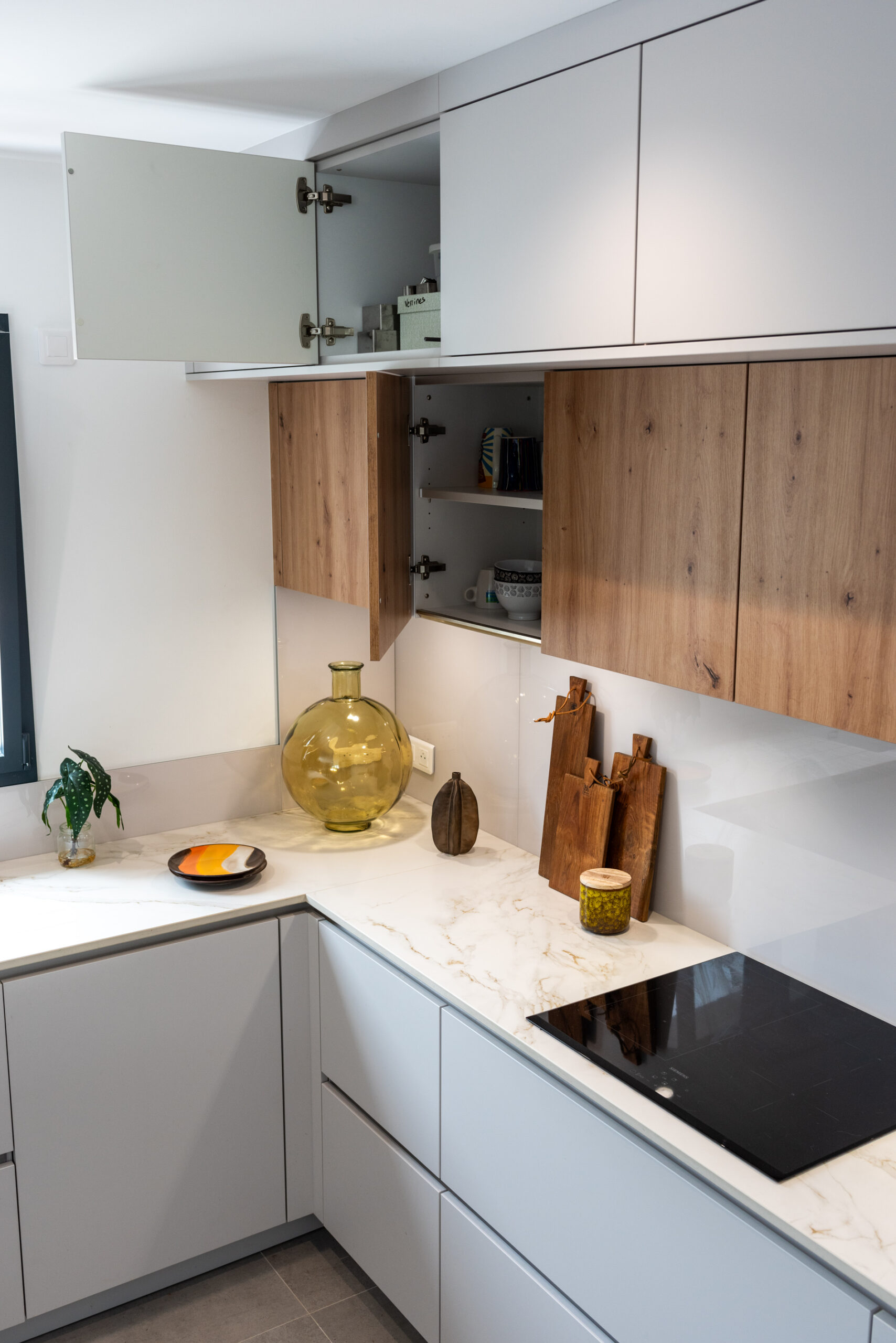 Cette cuisine à l’esprit minimaliste résolument contemporain inspire la sérénité. Le jeu des matériaux entre effets bois, marbre et façades lisses apporte contraste et chaleur. L’équilibre parfait comme le yin et le yang !