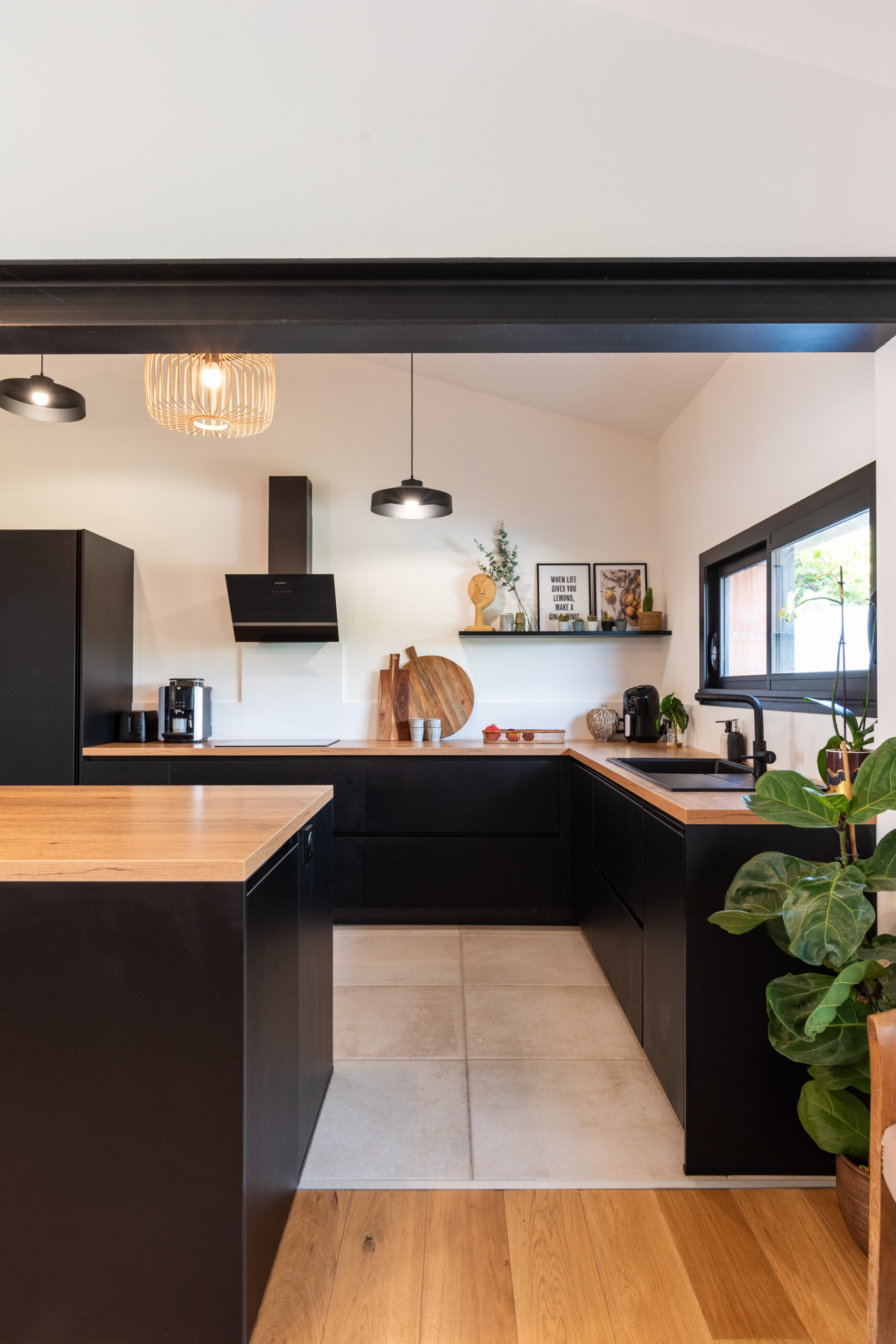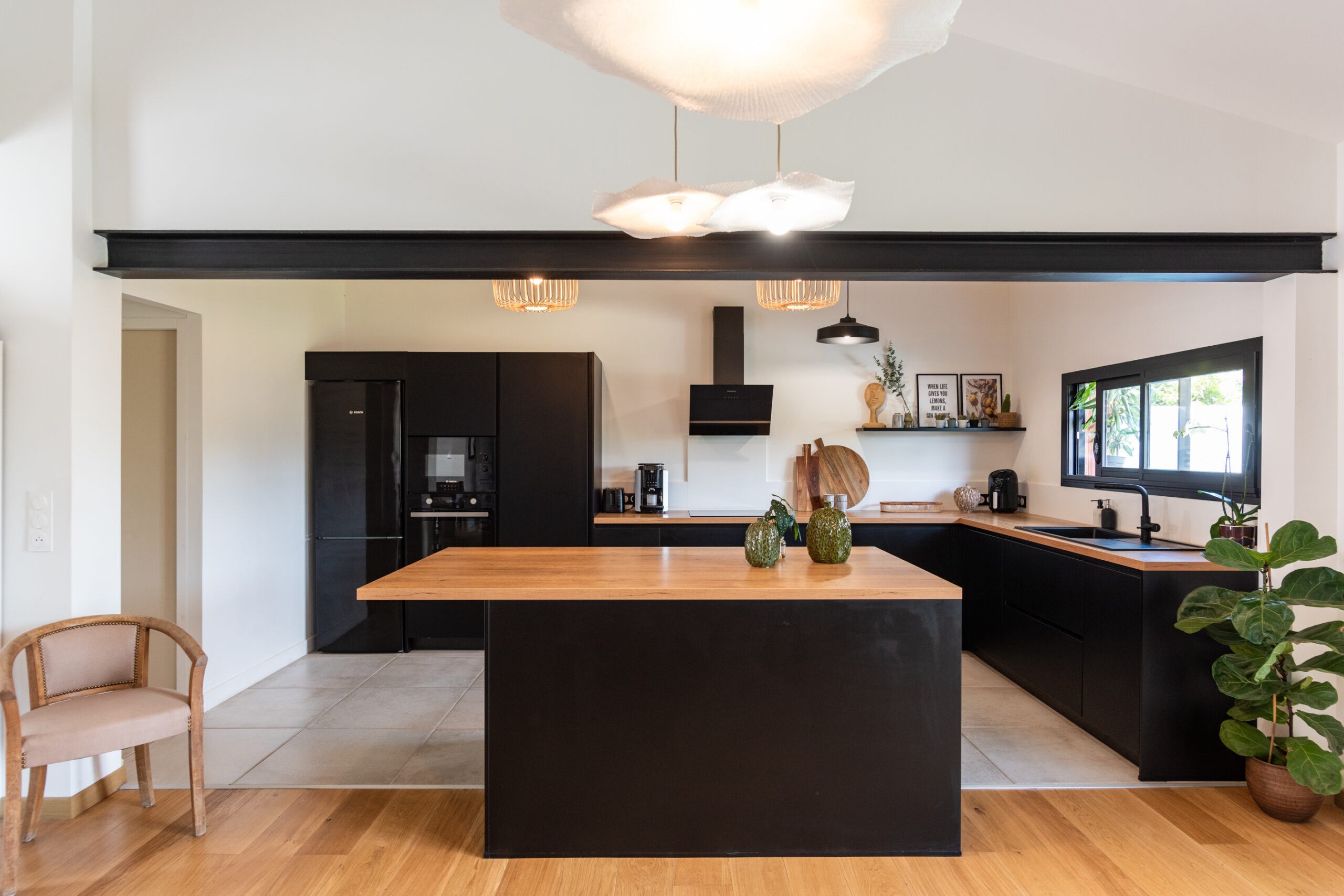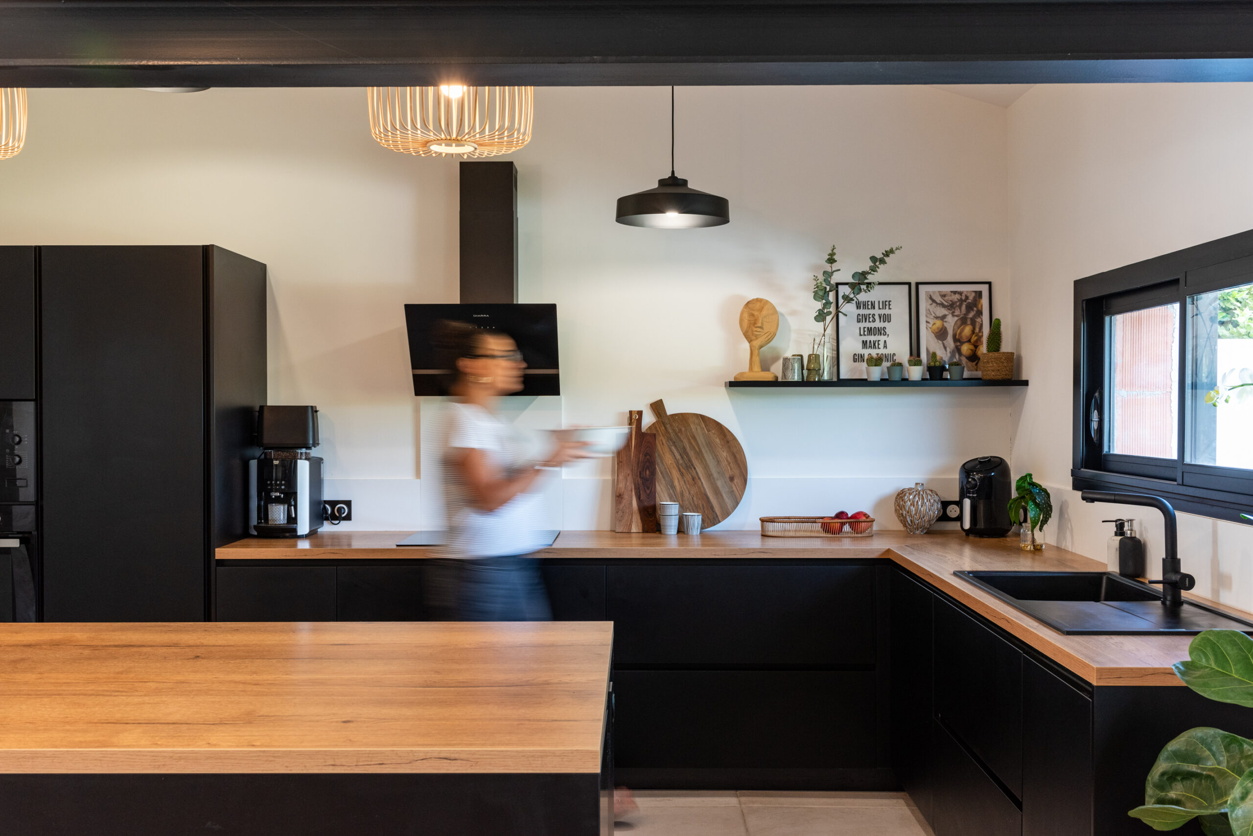 Une cuisine noire qui ne manque pas de relief ! L’équation est ultra efficace : le mariage du contemporain et de l’ancien, du noir et du bois dans un écrin blanc. Résultat une cuisine parfaitement intégrée à la pièce de vie, un style élégant, intemporel et convivial !