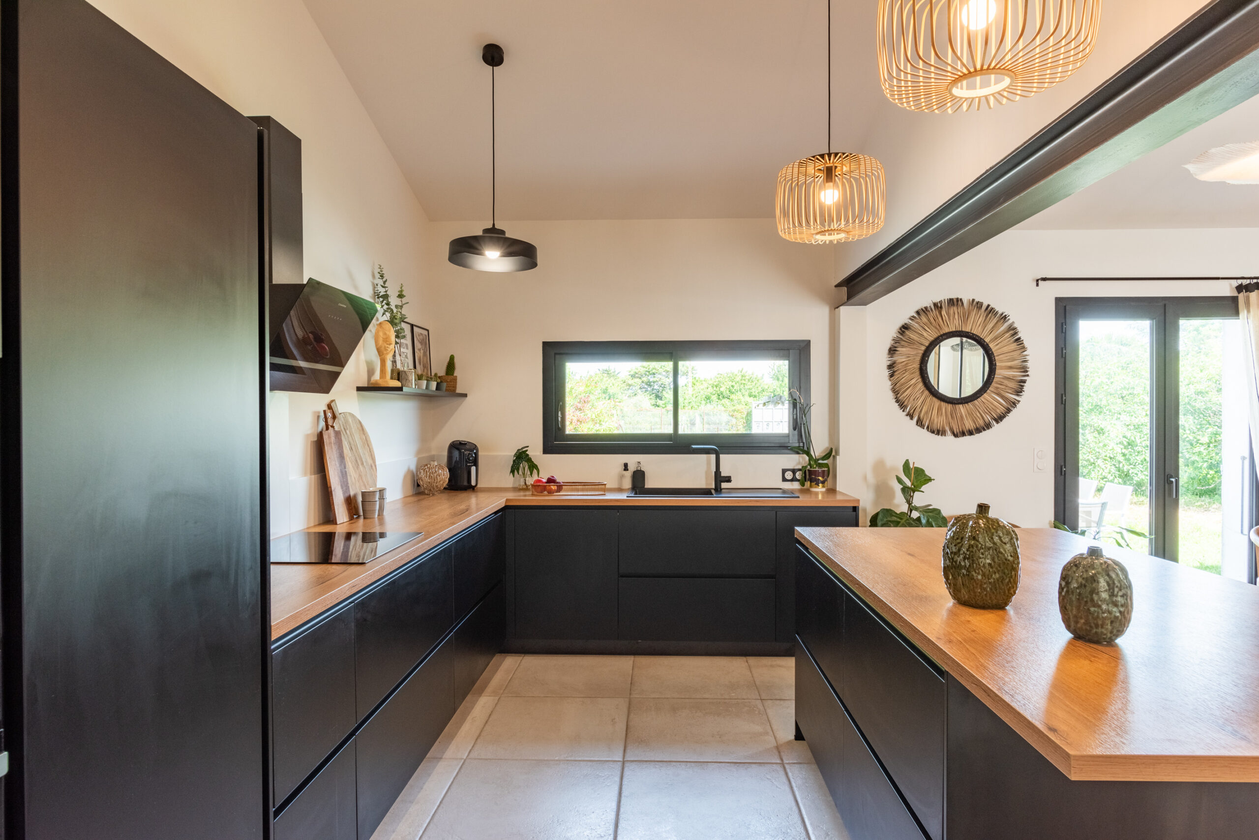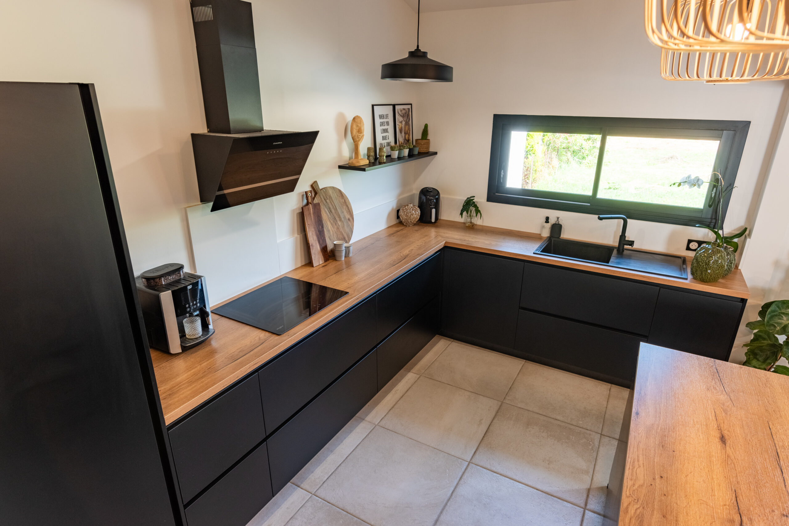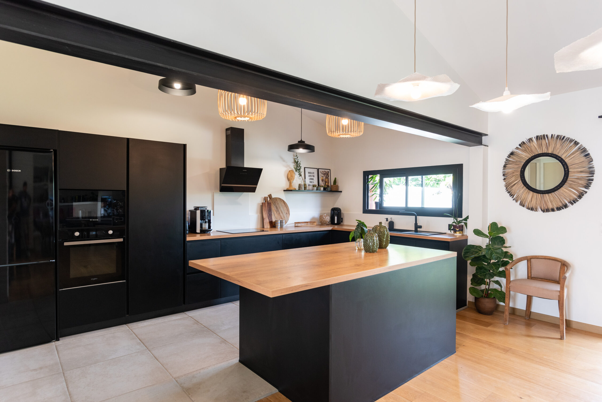 Une cuisine noire qui ne manque pas de relief ! L’équation est ultra efficace : le mariage du contemporain et de l’ancien, du noir et du bois dans un écrin blanc. Résultat une cuisine parfaitement intégrée à la pièce de vie, un style élégant, intemporel et convivial !
