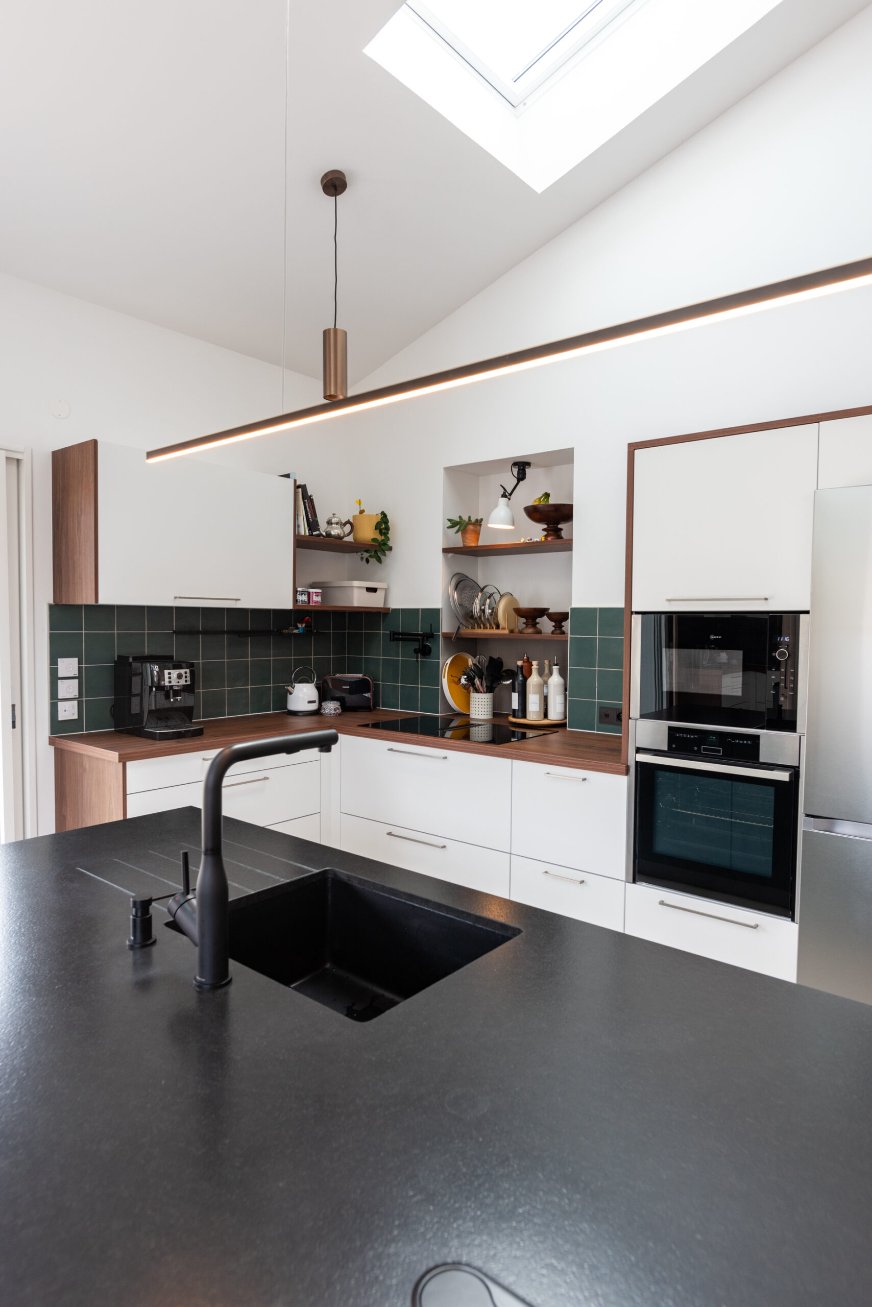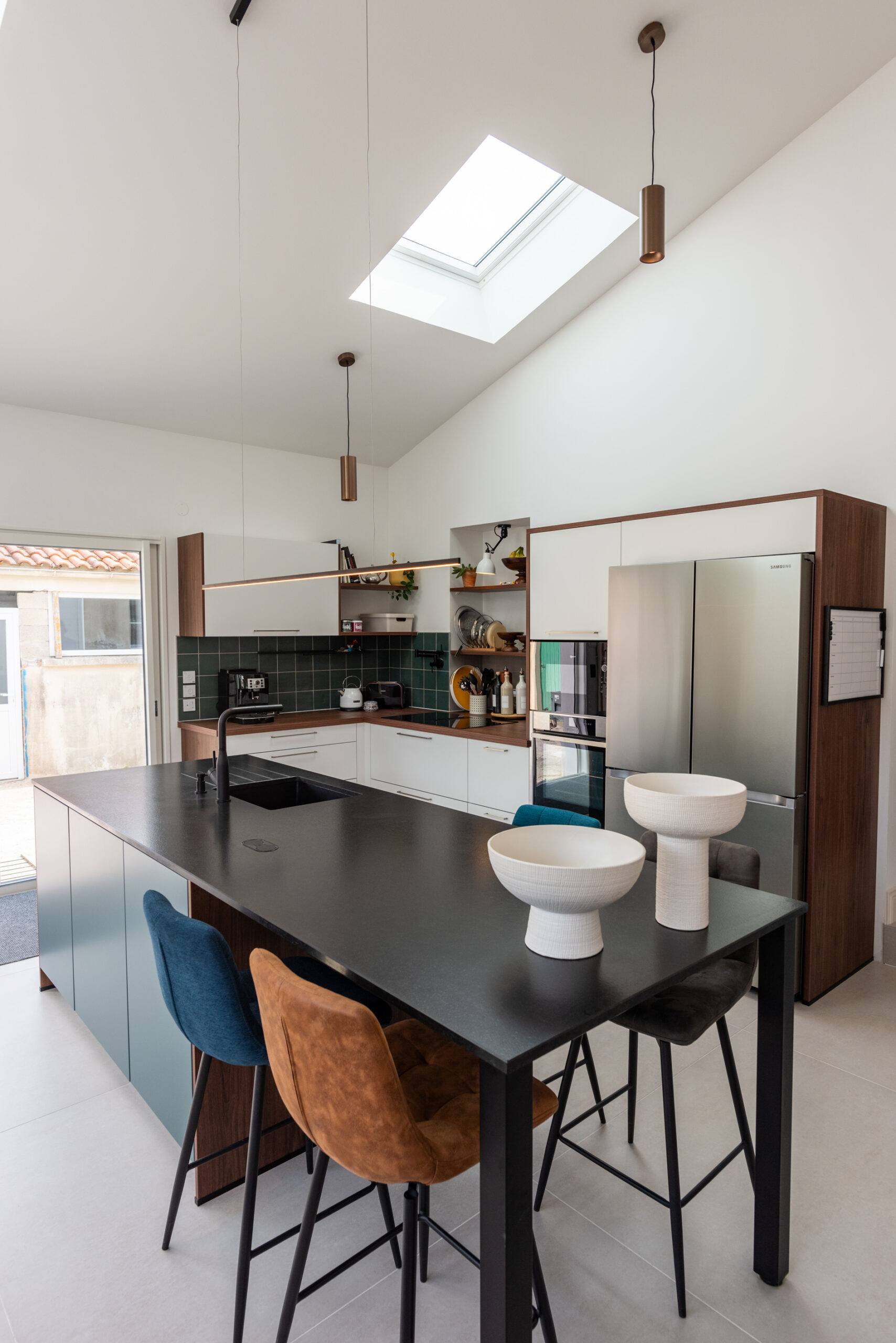 Lumineuse et graphique, cette cuisine ouverte sur la pièce de vie mixe couleurs et matériaux. Son grand ilot central en granit noir s’inscrit au cœur de la pièce de vie et rend l’espace chaleureux et contemporain !
