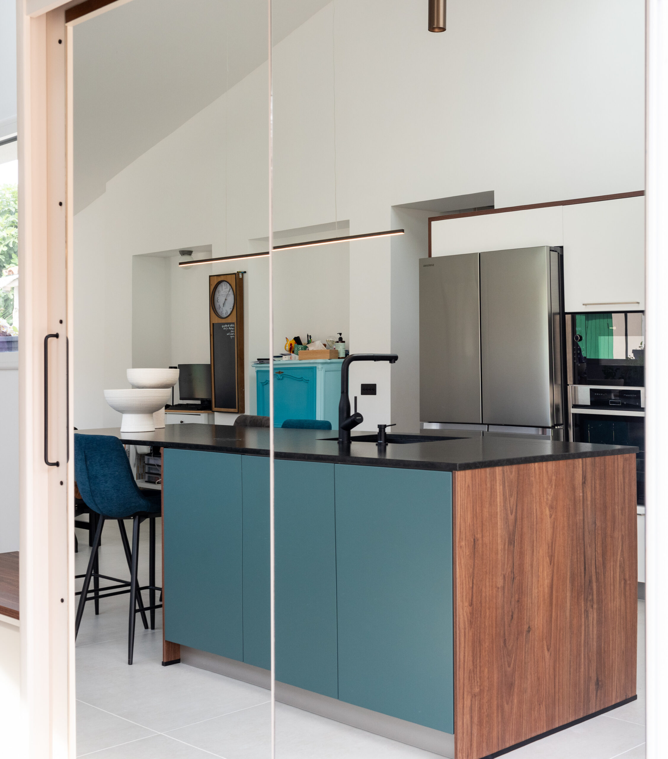 • La crédence en faïence verte répond aux façades azur de l’ilot.