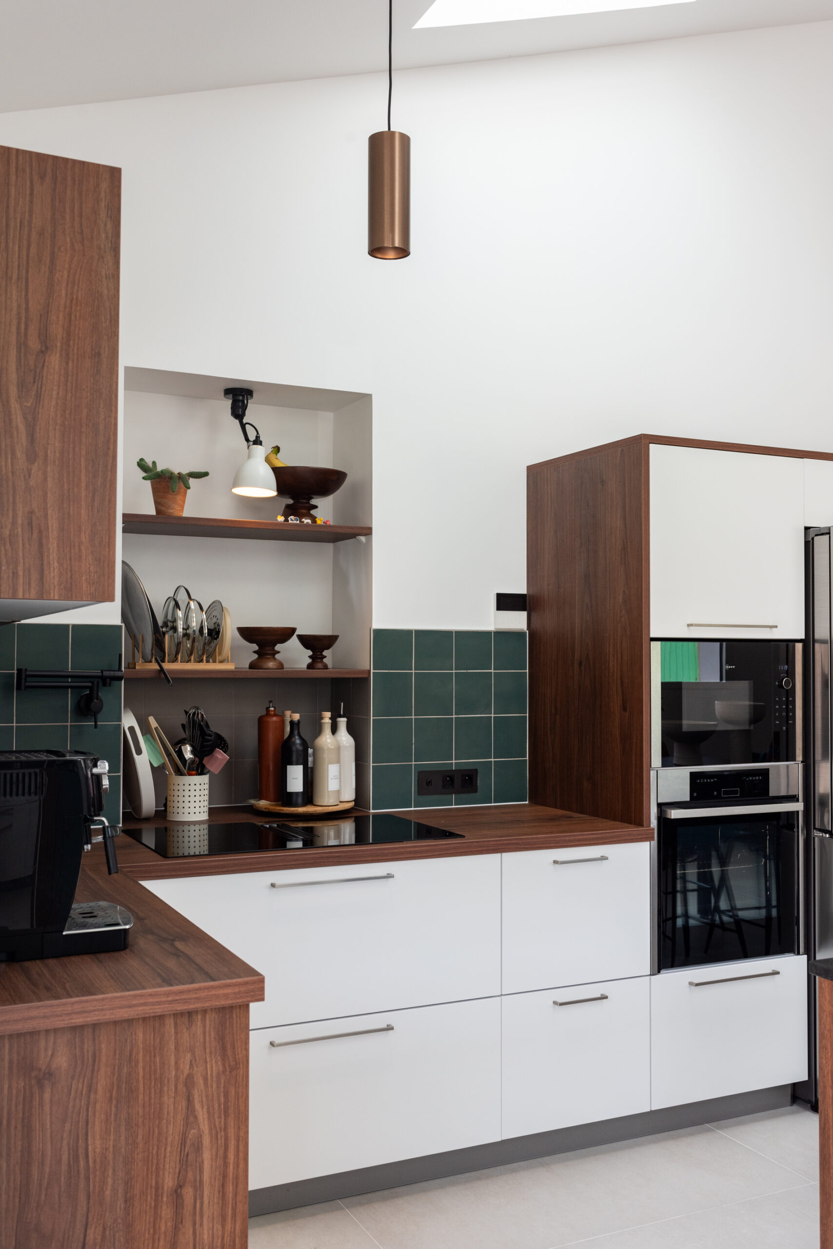 • Le plan de travail et la structure des meubles effet noyer qui contrastent avec les façades et réchauffent l’ensemble.