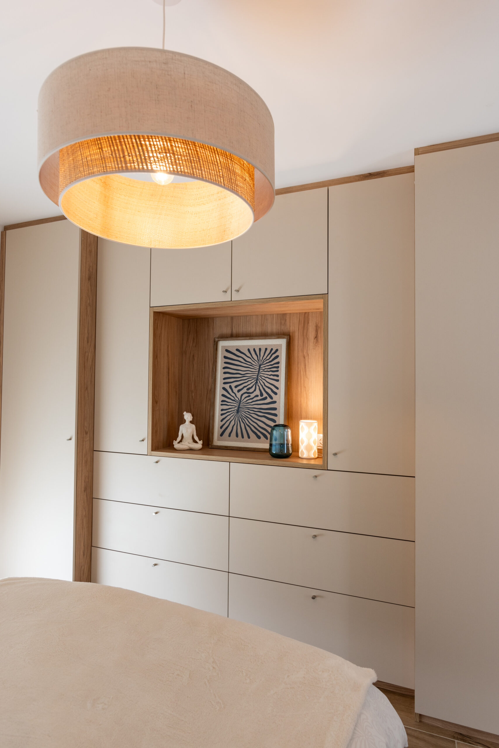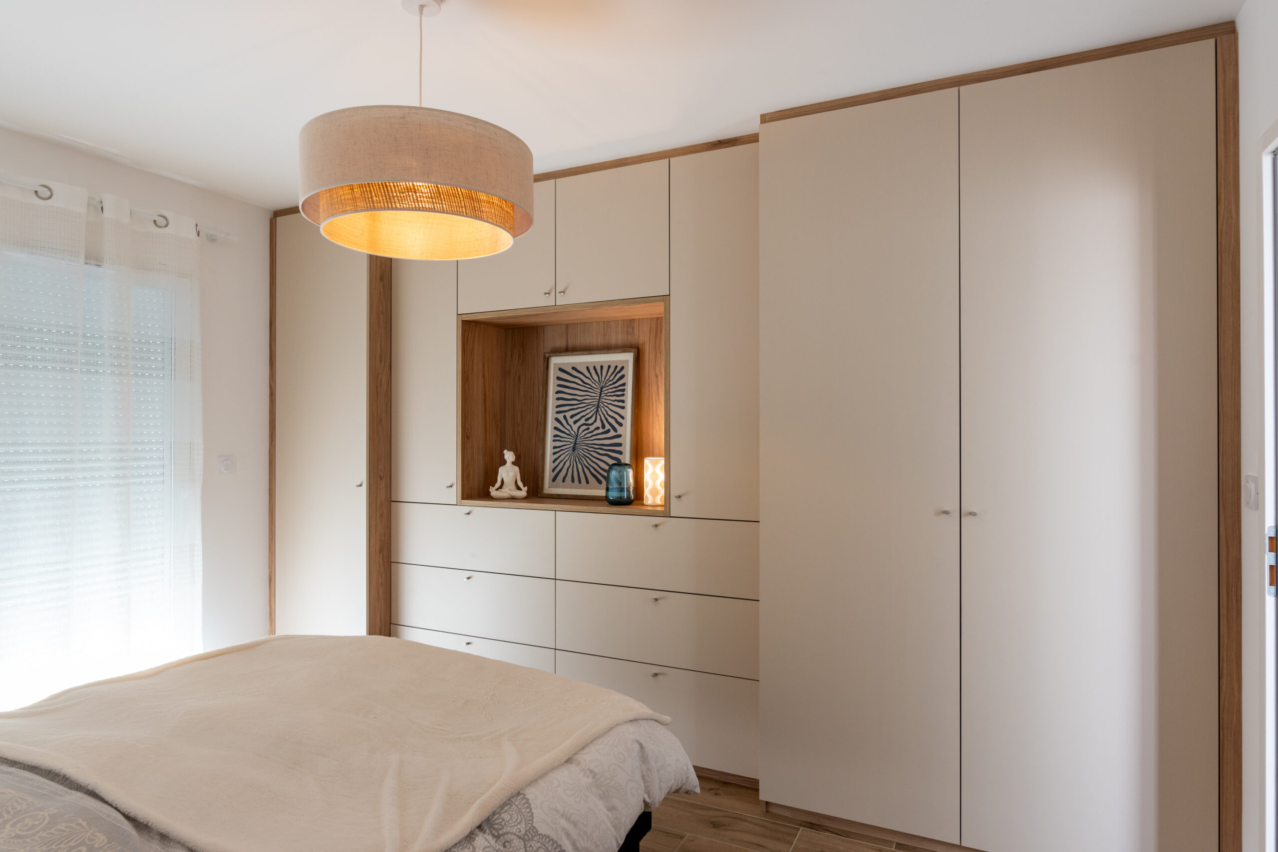 Avec ses lignes contemporaines et ses teintes naturelles, ce dressing offrant une grande capacité de rangement s’intègre aisément dans cette petite chambre ! Il participe grandement à faire de cette espace un vrai cocon de douceur !