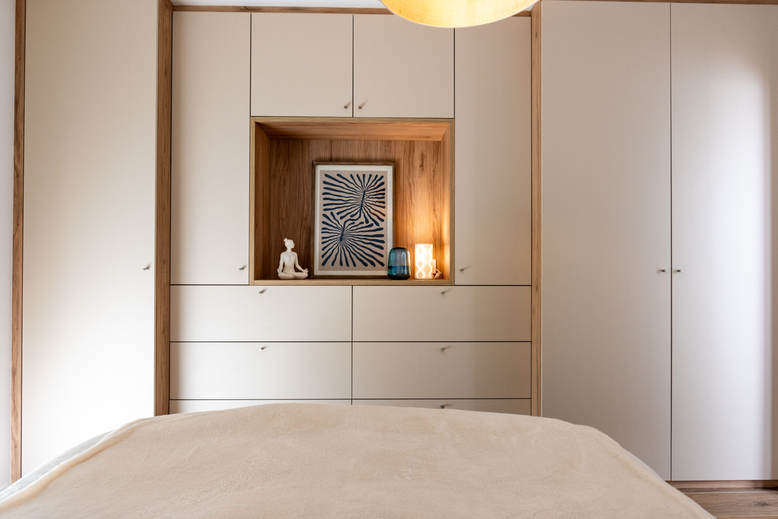 - Le coloris beige apporte de la luminosité, il est réhaussé par la structure et la niche effet bois.