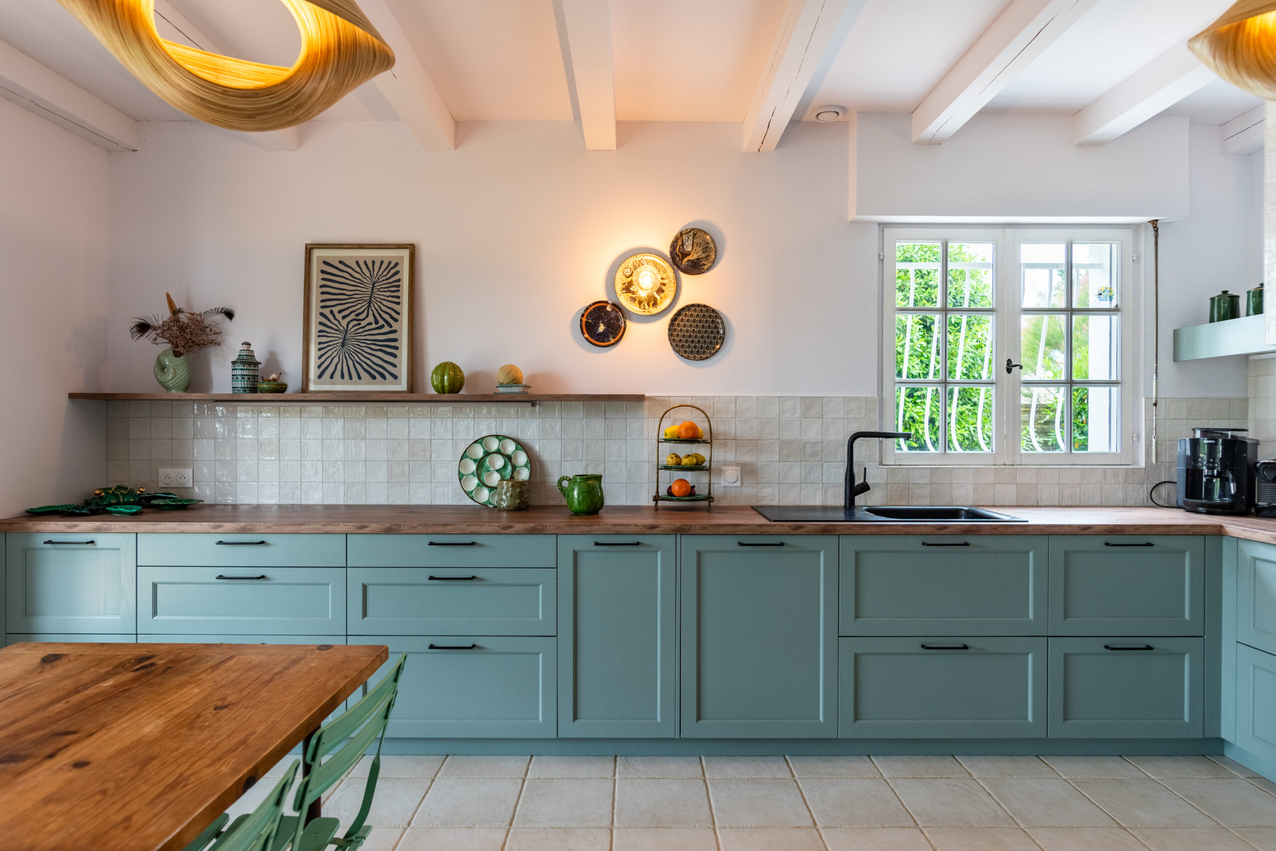 - La crédence et la hotte en zelliges blanches apporte de la brillance et de la luminosité tout en restant dans un style artisanal raffiné.