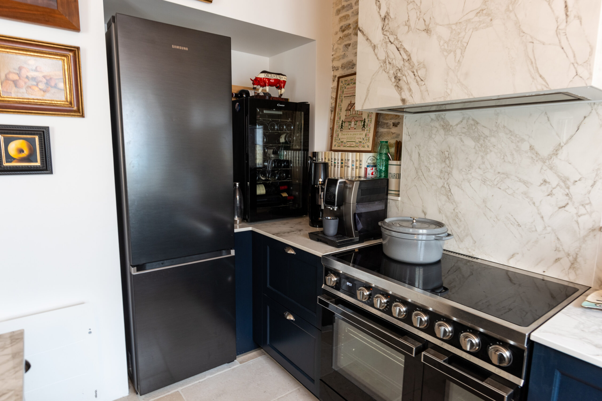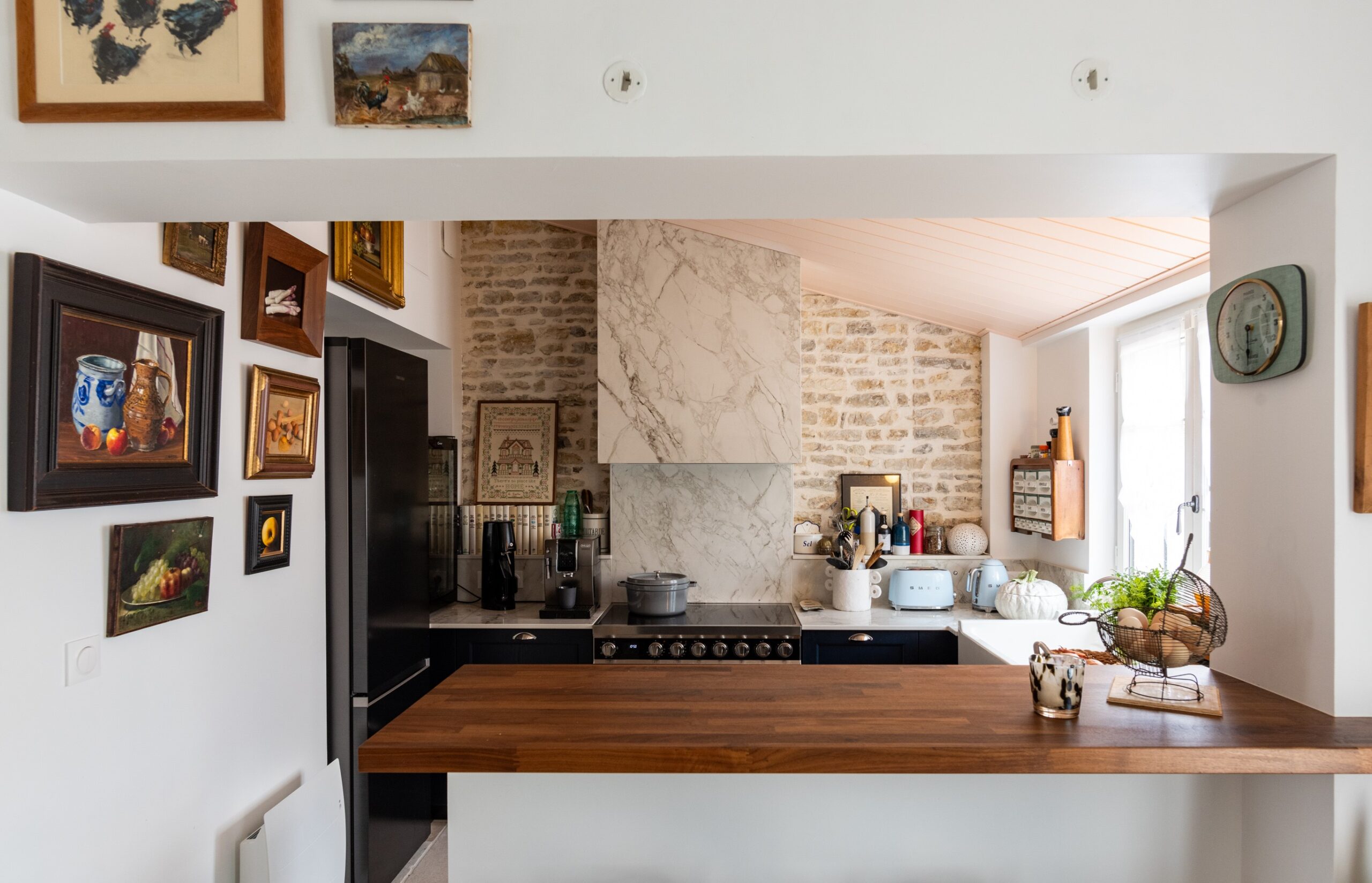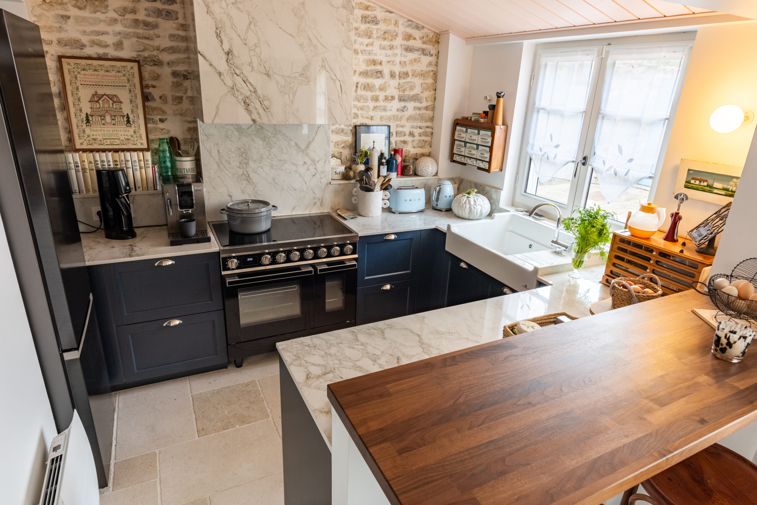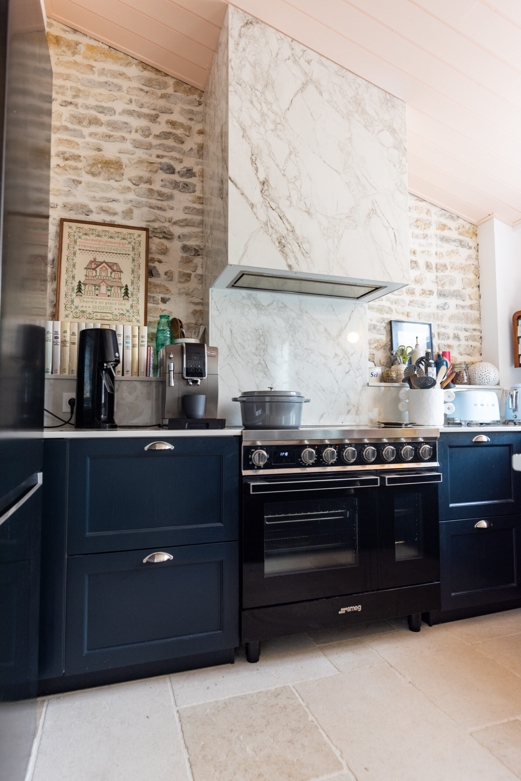 Nichée dans une ancienne bâtisse oléronaise cette petite cuisine a tout d’une grande ! La céramique effet marbre, les murs en pierres, le bleu profond, le rose du plafond, les objets chinés et les jolies façades créent un univers unique et chaleureux. La pièce maîtresse de la cuisine : le piano de cuisson surmonté d’une hotte intégrée habillée de céramique Dekton !