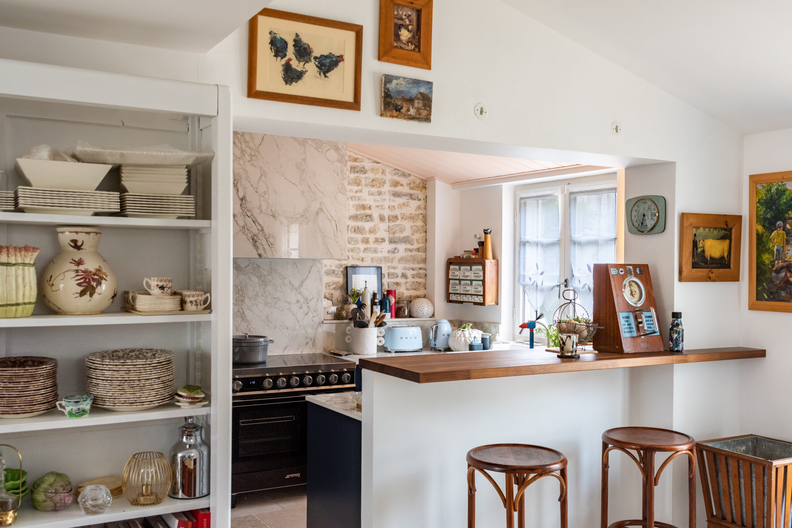 - Une crédence avancée qui permet d’épouser le mur de pierre et créé du rangement supplémentaire.